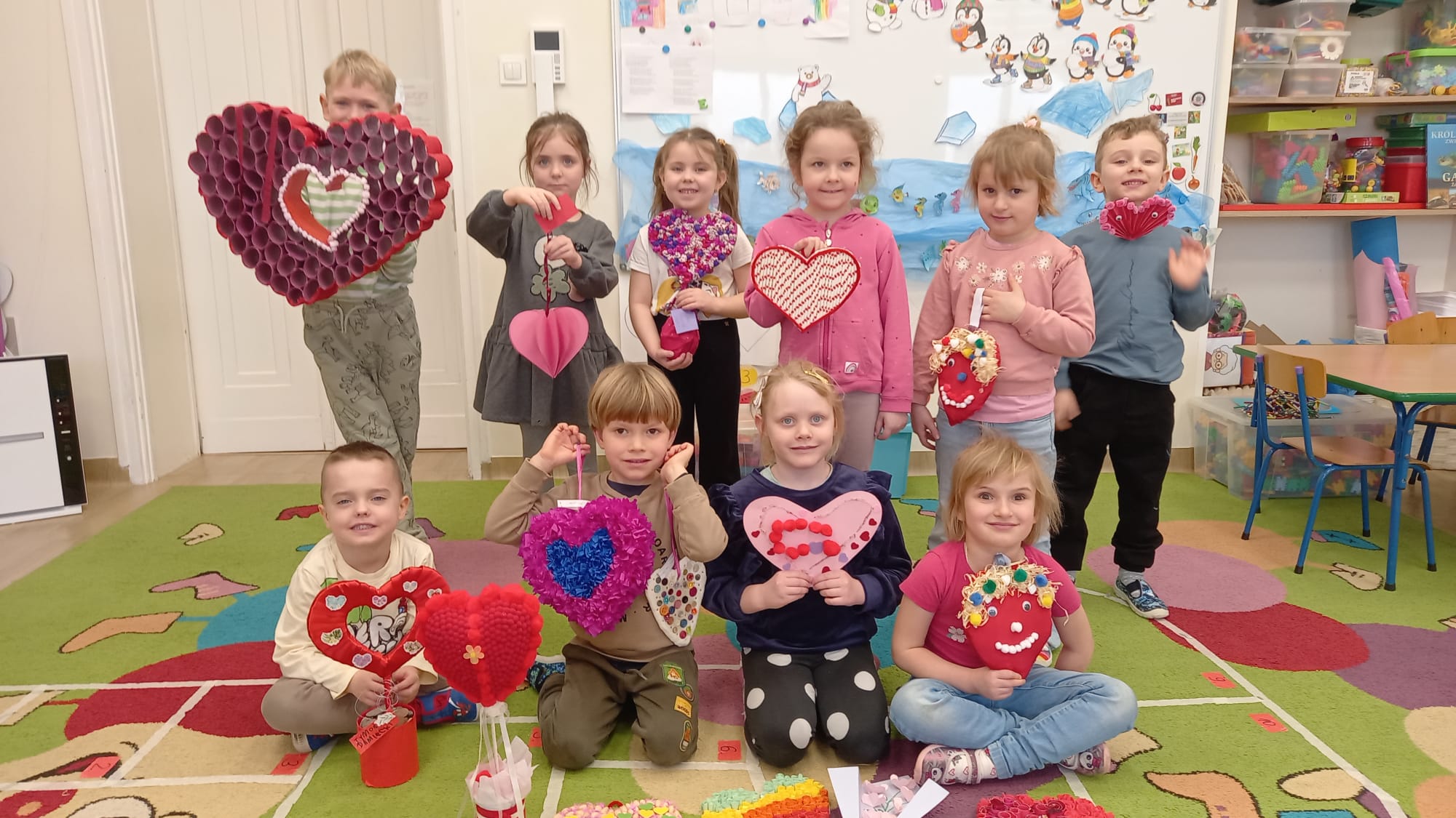 Dzieci wraz z rodzicami, rodzeństwem i dziadkami przygotowały niezwykle różnorodne prace – pełne serca, kreatywności i rodzinnego ciepła. Każde „serduszko” było inne, wyjątkowe i wykonane z ogromnym zaangażowaniem. Widać było, ile wspólnego czasu, rozmów i uśmiechu towarzyszyło ich tworzeniu.