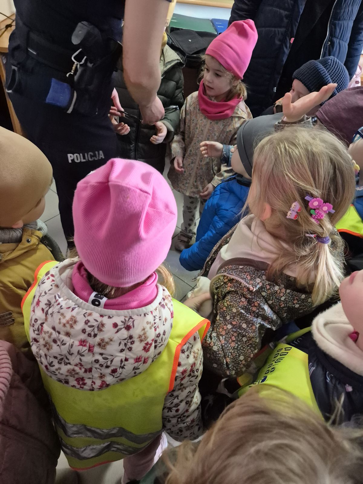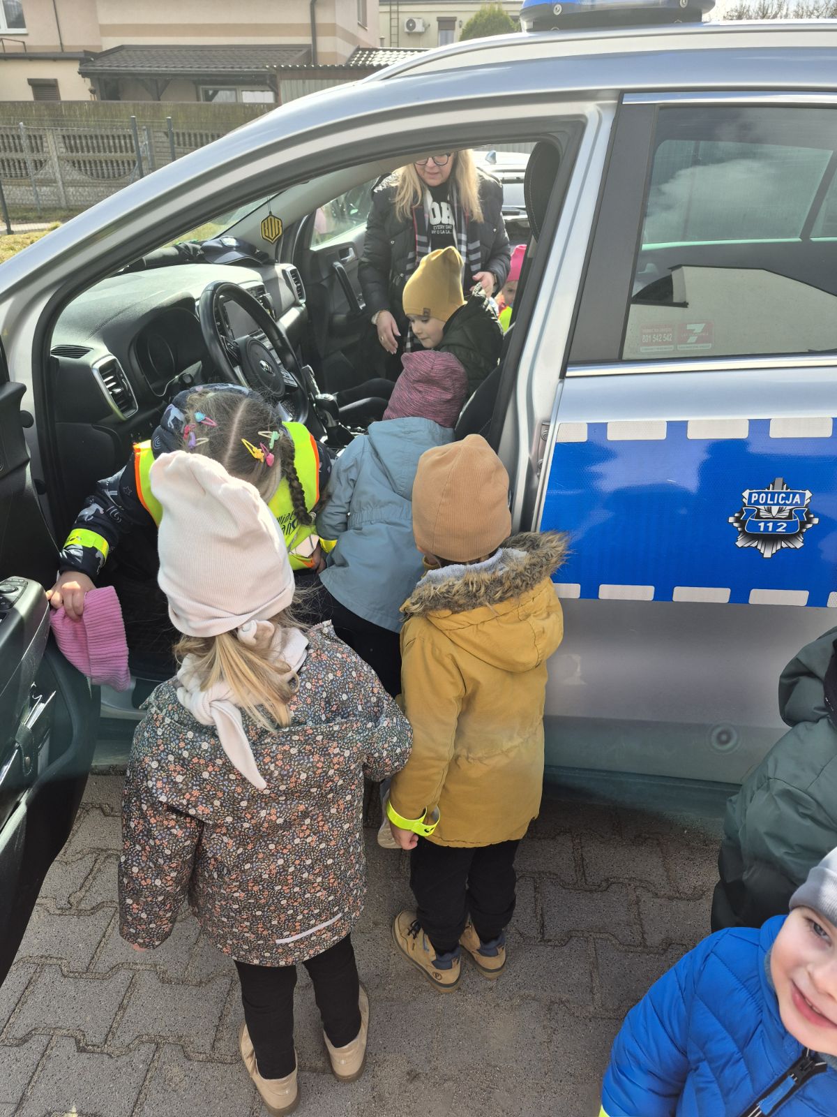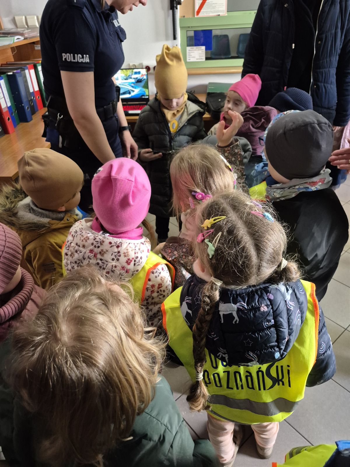 Następnie Pani policjantka oprowadziła dzieci po komisariacie, pokazując miejsca pracy policjantów. Dzieci miały również okazję zobaczyć radiowozy, co wzbudziło duże zainteresowanie i radość.