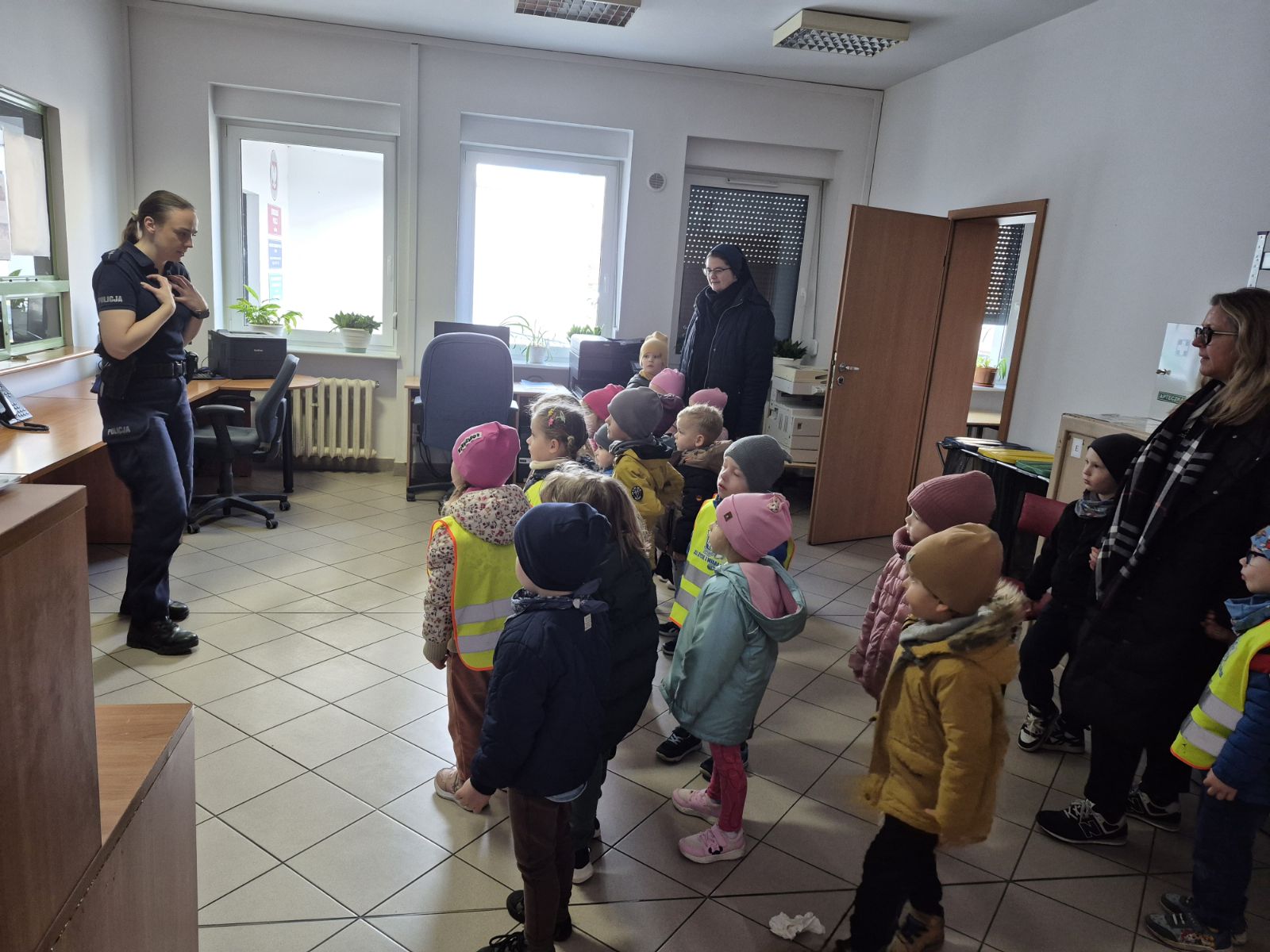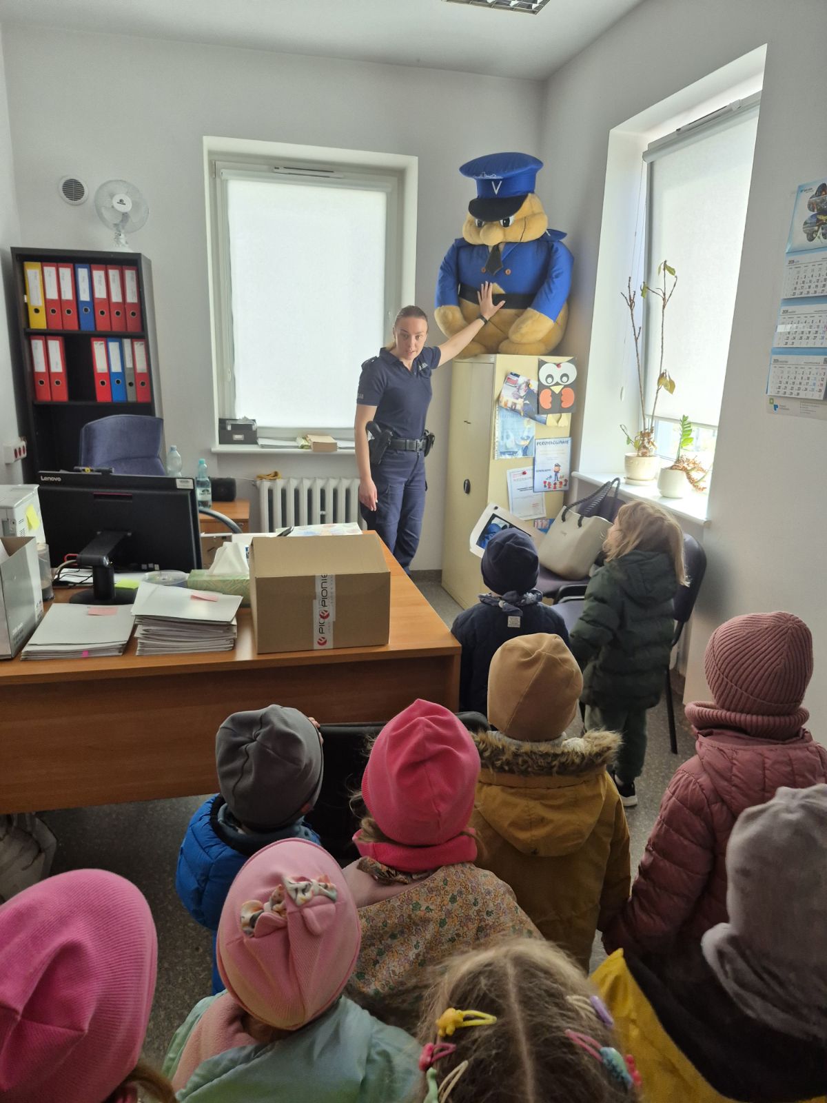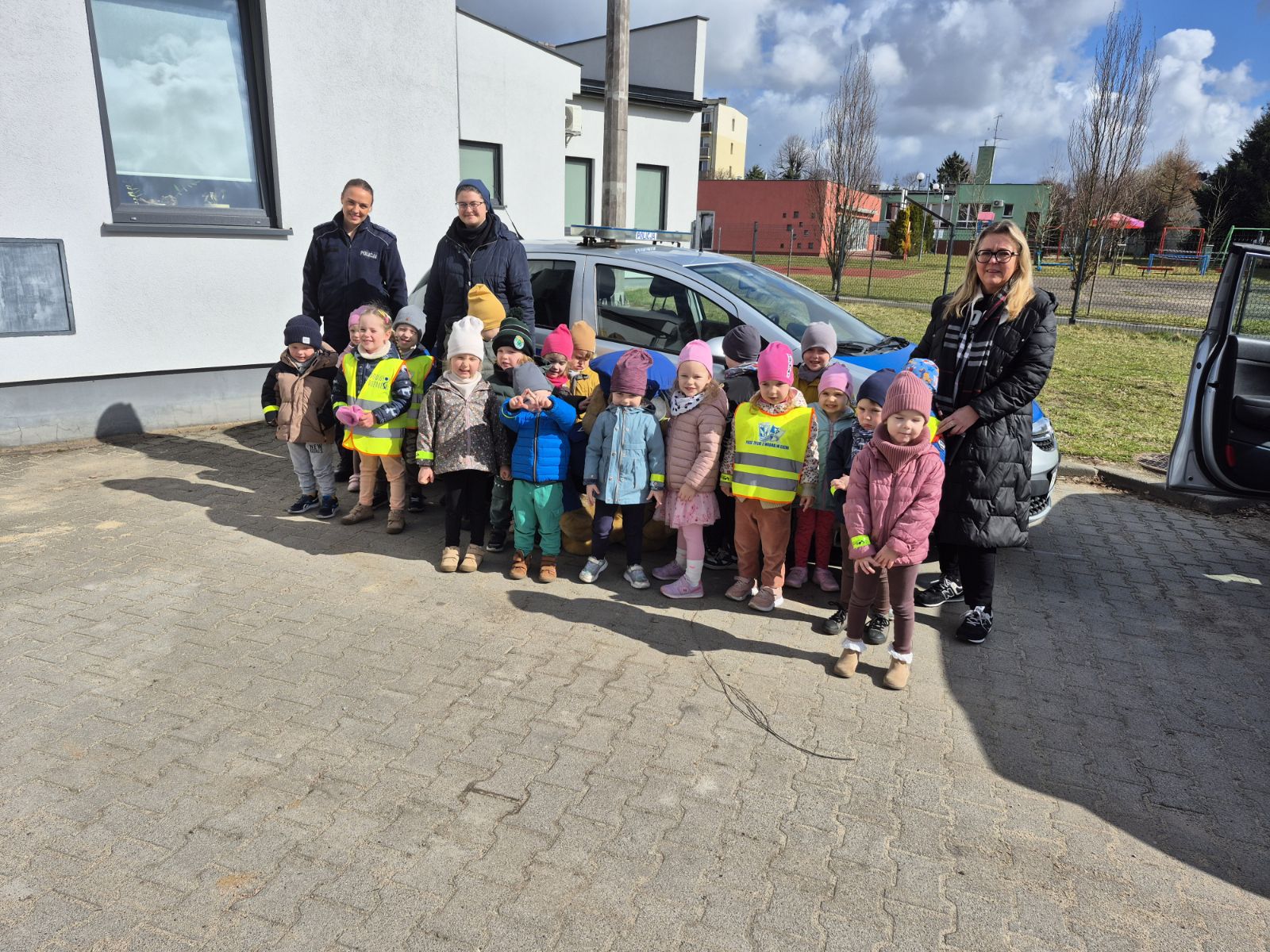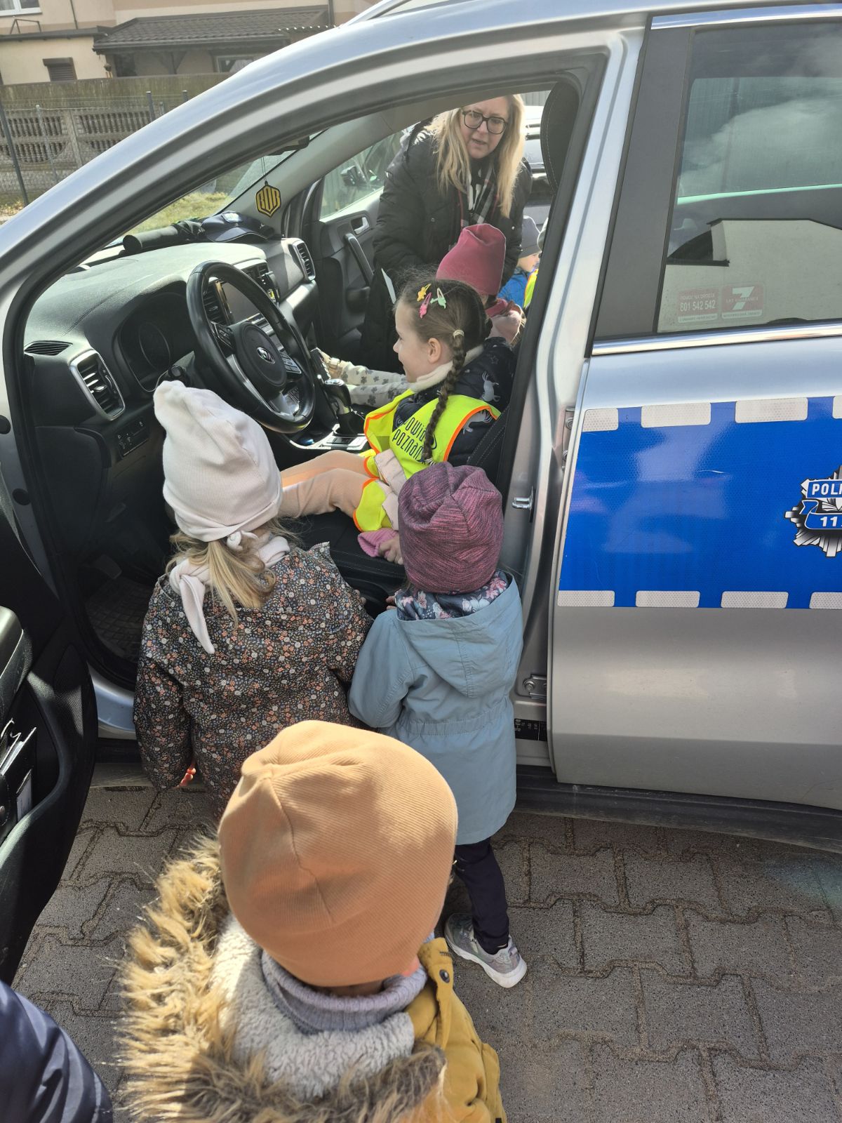 Następnie Pani policjantka oprowadziła dzieci po komisariacie, pokazując miejsca pracy policjantów. Dzieci miały również okazję zobaczyć radiowozy, co wzbudziło duże zainteresowanie i radość.