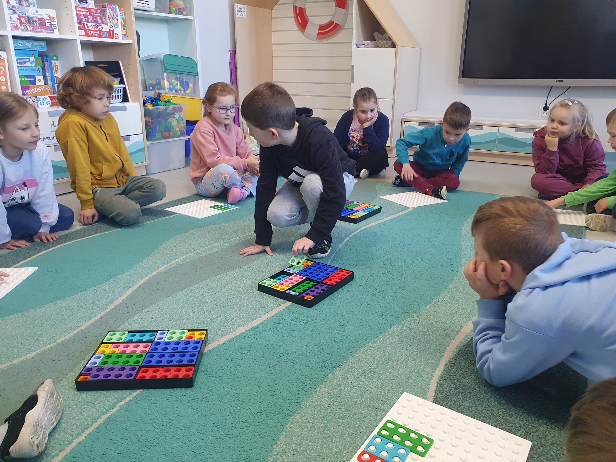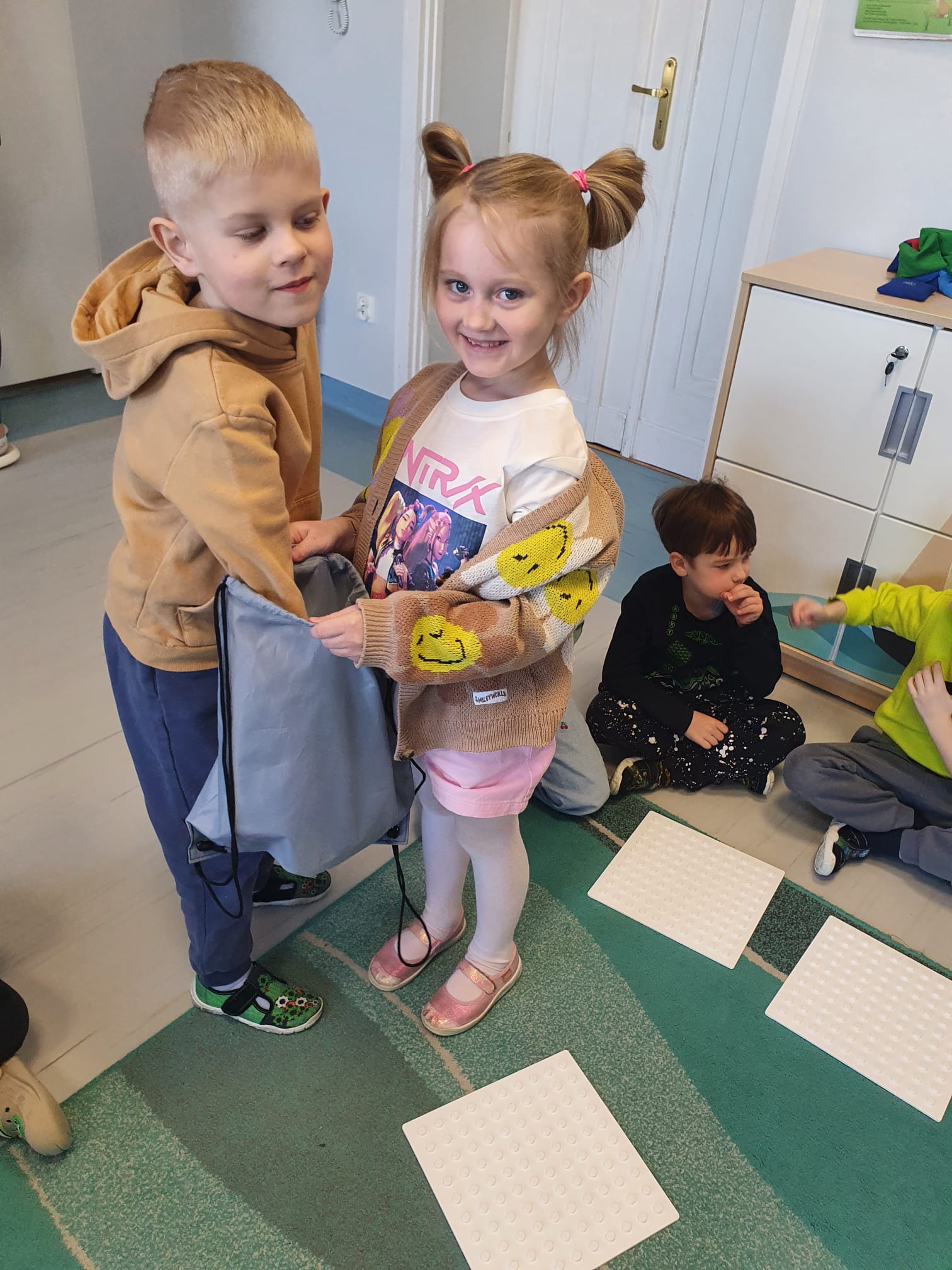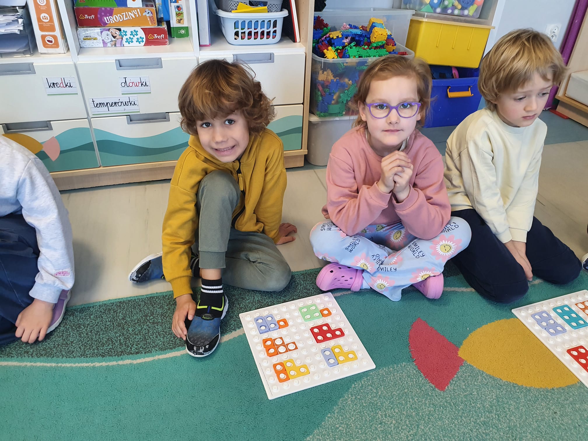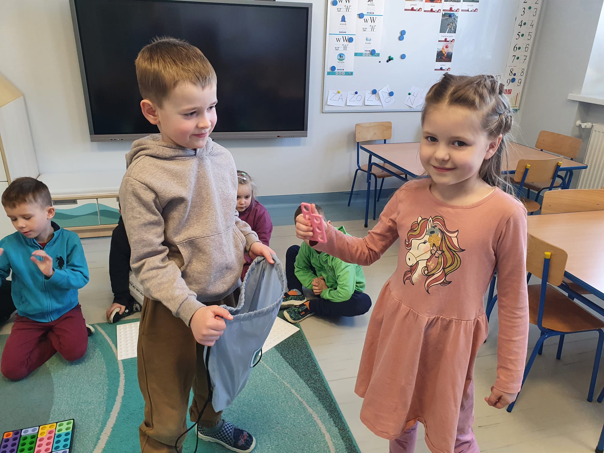Podczas zajęć przedszkolaki rozpoznawały kształty za pomocą dotyku, korzystając z „magicznego worka”, odwzorowywały je na kolorowych nakładkach oraz brały udział w zabawach z ruletką. Dzieci uczyły się także dopasowywać i nazywać liczby odpowiadające poszczególnym kształtom.